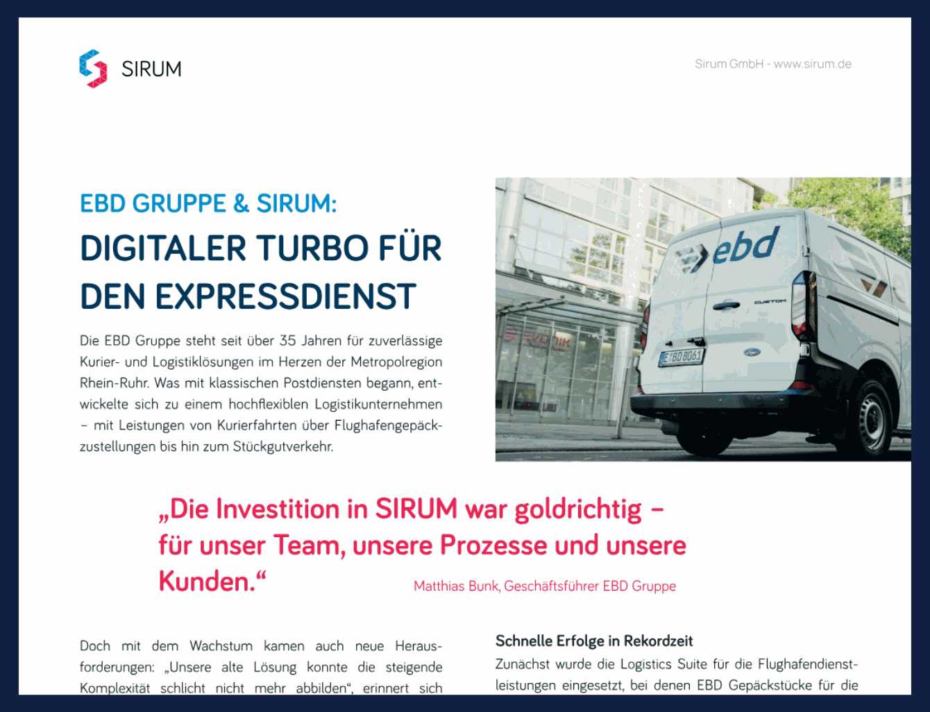Laden Sie sich hier die Kundenstory mit der EBD Gruppe herunter und erfahren Sie, wie EBD mit unserer Logistiklösung Prozesse schlanker und schneller gestaltet.